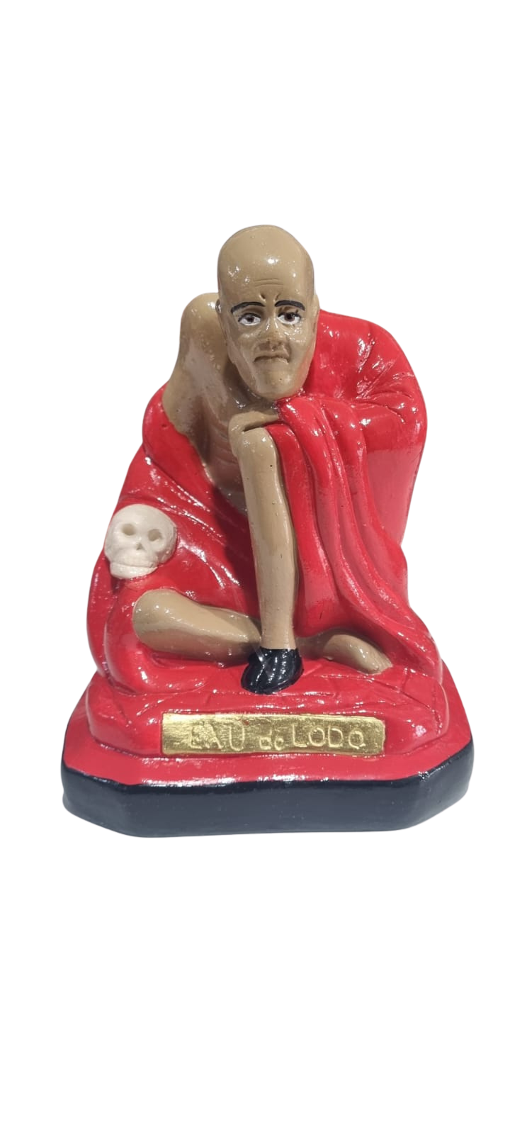 Estatueta feita em gesso pintado em vermelho, representando a figura de Exú do Lodo com detalhes expressivos e acabamento em tom vibrante para decoração ou uso ritual. A peça é uma réplica detalhada que traz uma presença marcante para quem busca tradição e simbologia na decoração.